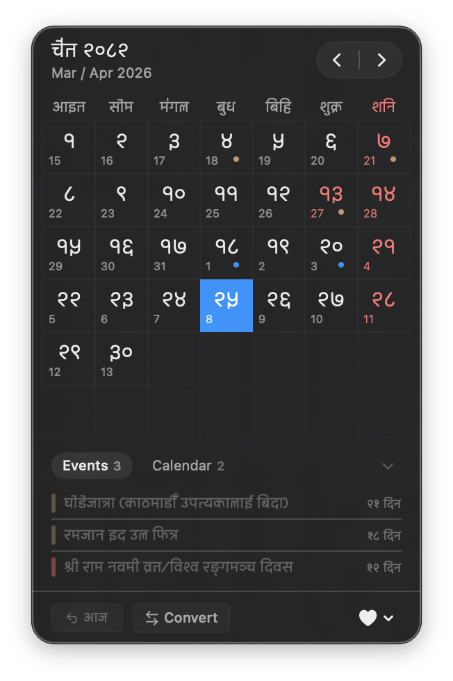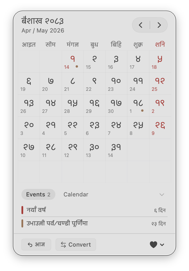 A minimal macOS app that keeps you connected to the Nepali calendar.