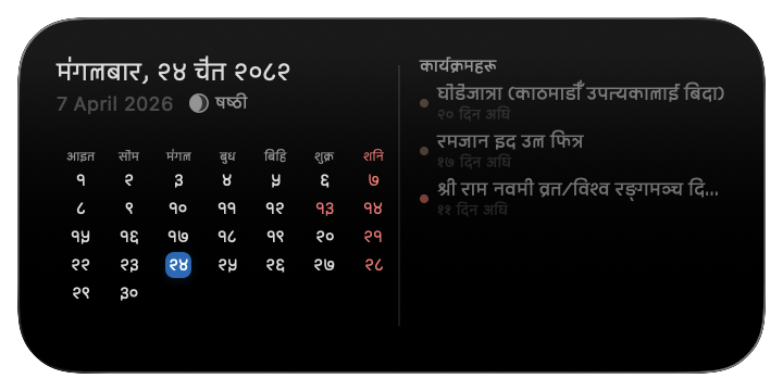 Glance at today's Nepali date, tithis, and festivals right from your home screen.